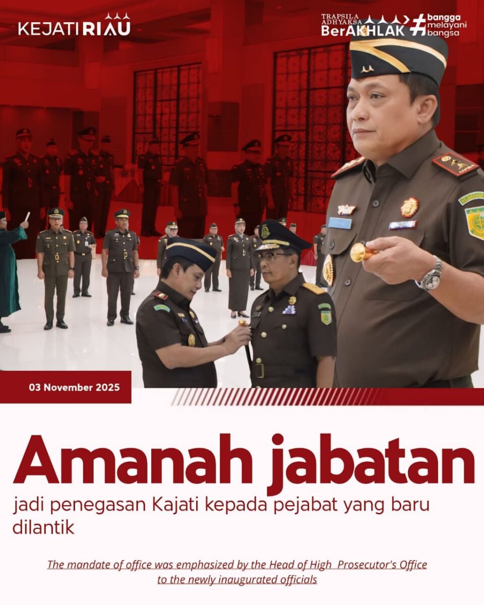 Kajati Sutikno SH., MH., melantik pejabat eselon II & III di lingkungan Kejati Riau di Sasana H.M. Prasetyo gedung Satya Adhi Wicaksana. (03/11/2025)