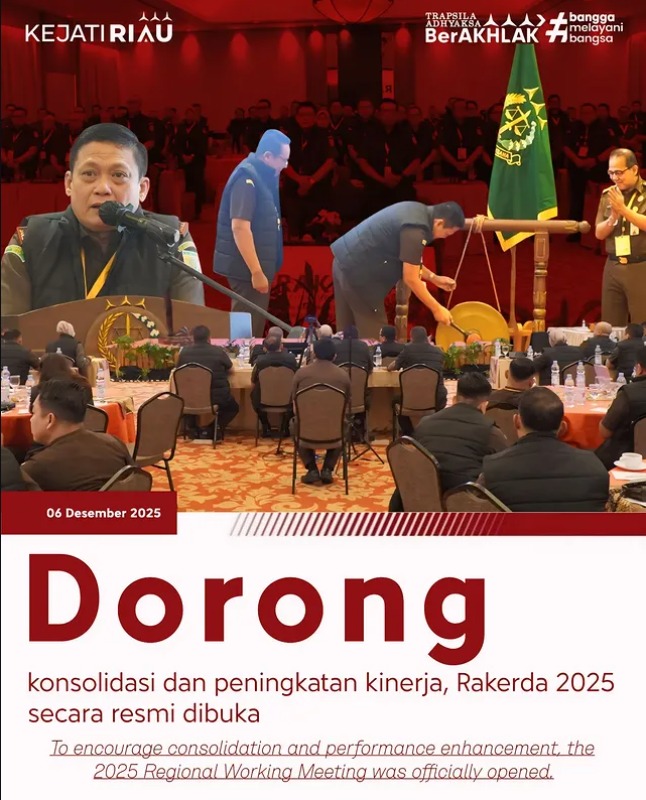 Kajati Sutikno SH., MH., secara resmi membuka Rakerda Kejati Riau yang diikuti oleh para PJU, Kajari, serta jajaran secara hybrid di Ballroom Lt.12 Grand Zuri Hotel. (06/12/2025)