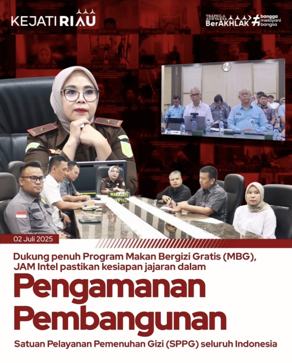 Wakajati Riau Rini Hartatie SH., MH., beserta jajaran Intelijen ikuti Rapat Koordinasi Teknis Dukungan Pelaksanaan Program Makan Bergizi Gratis (MBG) yang dibuka oleh JAM Intel Prof. Dr. Reda Manthovani, SH., LL.M. secara daring dari rupat aka.(02/07/2025)