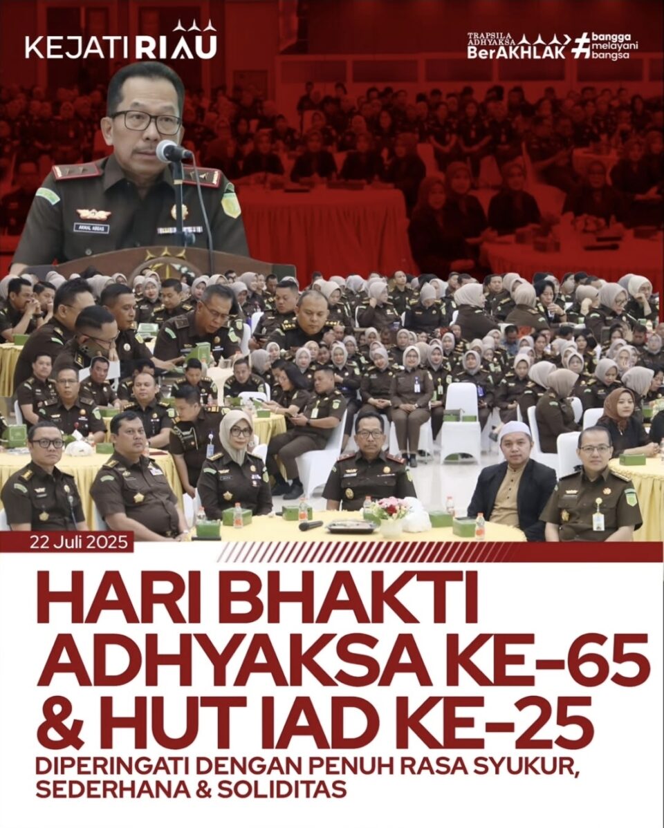 Kajati Riau Akmal Abbas SH., MH., membuka acara Syukuran dalam rangka Hari Bakti Adhyaksa Ke-65 dan HUT IAD Ke-25 yang diikuti seluruh Keluarga Besar Kejati Riau & IAD Wil. Riau di Sasana H.M. Prasetyo.(22/07/2025)
