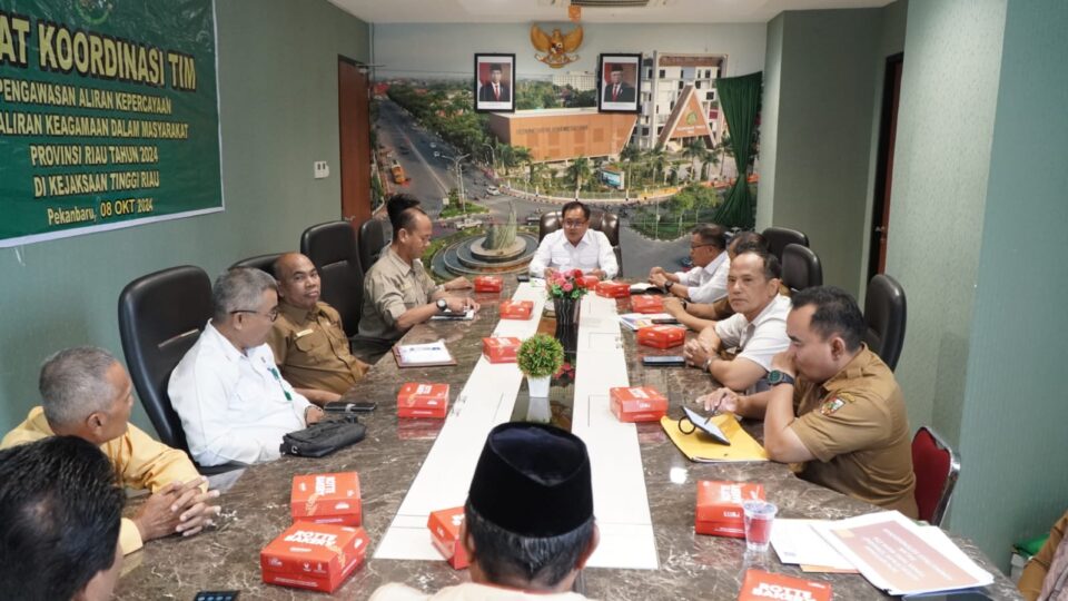 Kejaksaan Tinggi Riau menggelar Rapat Koordinasi Tim Pengawasan Aliran Kepercayaan dan Keagamaan Masyarakat (Pakem) yang dipimpin Kasi II (Sosial Kebudayaan dan Kemasyarakatan) pada Asisten Intelijen Sonang Simanjuntak, SH.MH diruang rapat Asintel. (08/10/2024)