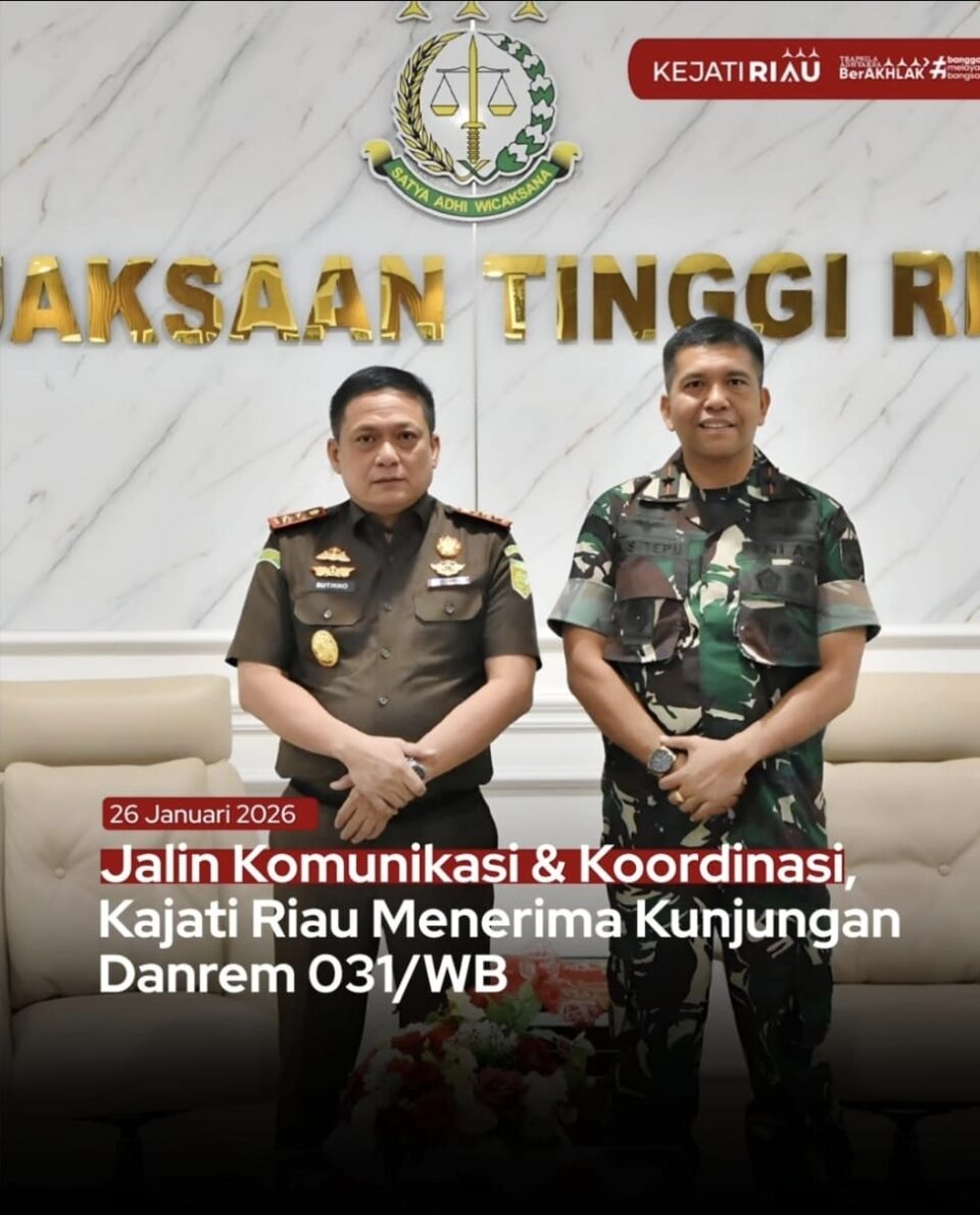 Kajati Riau Dr. Sutikno SH., MH., menerima kunjungan silaturahmi Danrem 031/WiraBima yang baru Brigjen TNI Dr. Agustatius Sitepu S.Sos., M.Si., M.Han., di ruang kerja Kajati. (26/01/2026)