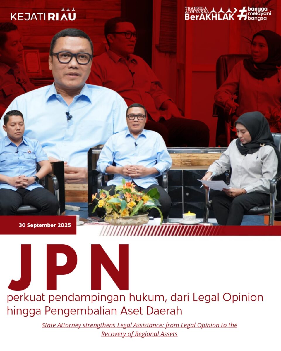 Melalui Program Jaksa Menjawab, Kejati Riau kembali menyampaikan tentang tugas dan fungsi bidang Datun melalui perannya sebagai Jaksa Pengacara Negara (JPN) dengan narasumber utama Asdatun Furkon Syah Lubis SH., MH., didampingi Kasi Pertimbangan Hukum Andriansyah, S.H., M.H., M.M., dalam program Jaksa Menjawab Riau TV yang disiarkan live pukul 14.00–15.00 WIB dari Studio Riau TV Jl. HR. Soebrantas Pekanbaru. (30/09/2025)