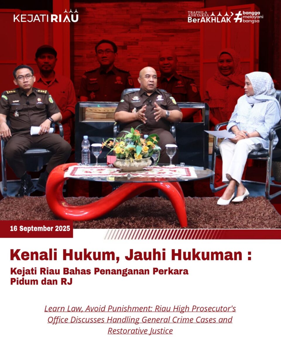 Kejati Riau kembali hadir melalui Program Jaksa Menjawab yang disiarkan secara langsung dari Studio Riau TV, Jl. HR. Soebrantas, Pekanbaru, dengan menghadirkan narasumber Aspidum Kejati Riau Otong Hendra Rahayu, S.H., M.H., bersama Kasi B Pidum Kicky Arityanto, S.H., M.H. (16/09/2025).