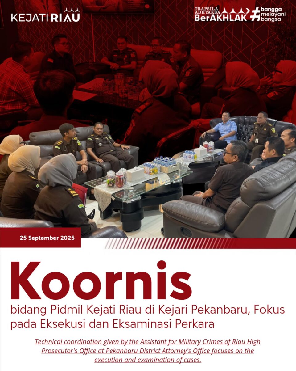 Bidang Pidmil Kejati Riau yang terdiri dari para Kasi, Jaksa Fungsional, dan staf melaksanakan kegiatan Koordinasi Teknis Eksekusi, Upaya Hukum Luar Biasa, dan Eksaminasi di Kejari Pekanbaru. (25/09/2025)