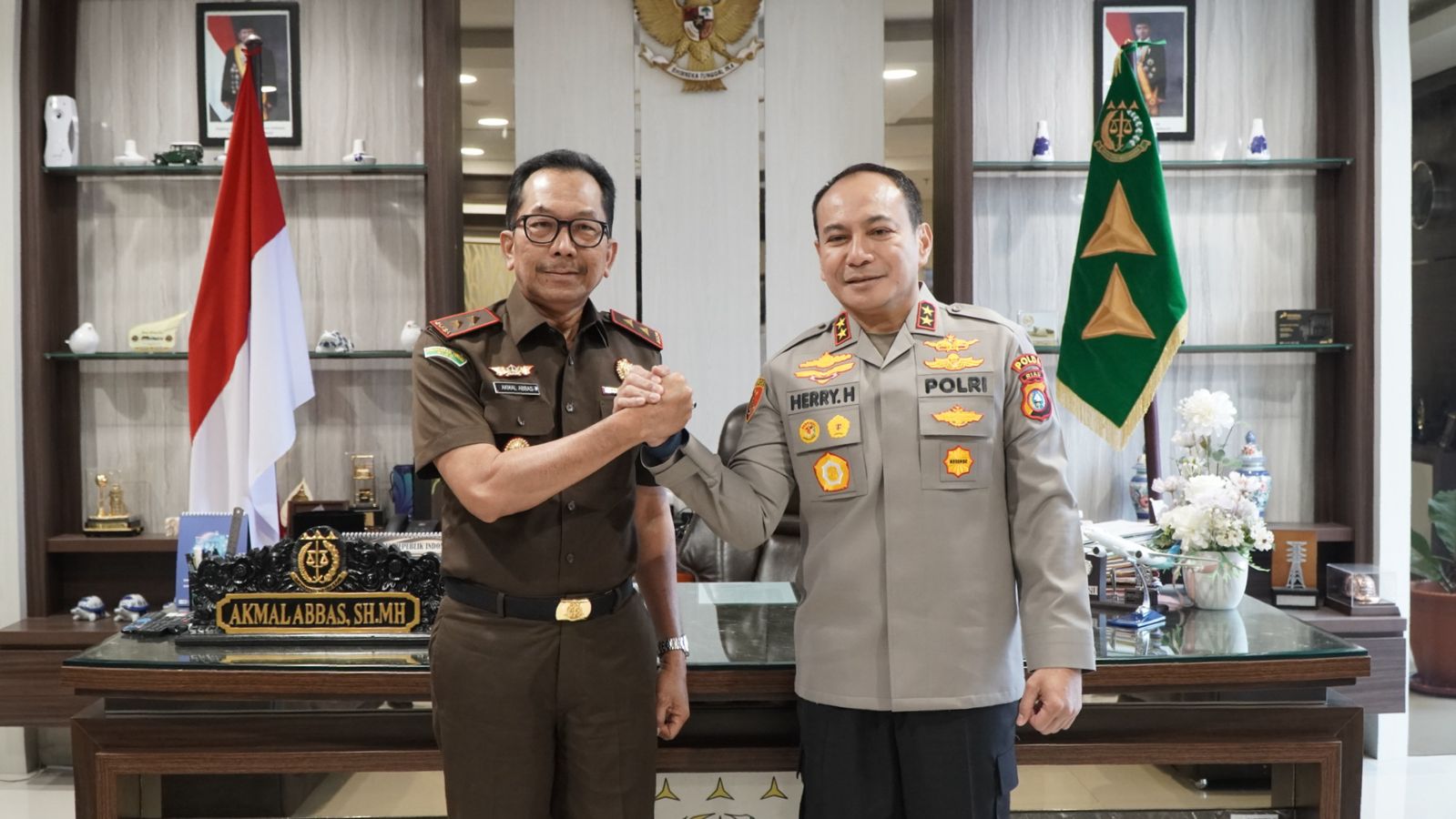 Kajati Riau Akmal Abbas SH., MH., didampingi Wakajati beserta para Asisten menerima kunjungan silaturahmi Kapolda Riau yang baru Irjen Pol Dr. Hery Herjawan, S.I.K., MH., M.Hum beserta PJU Polda Riau di ruang kerja Kajati.(18/03/2025)