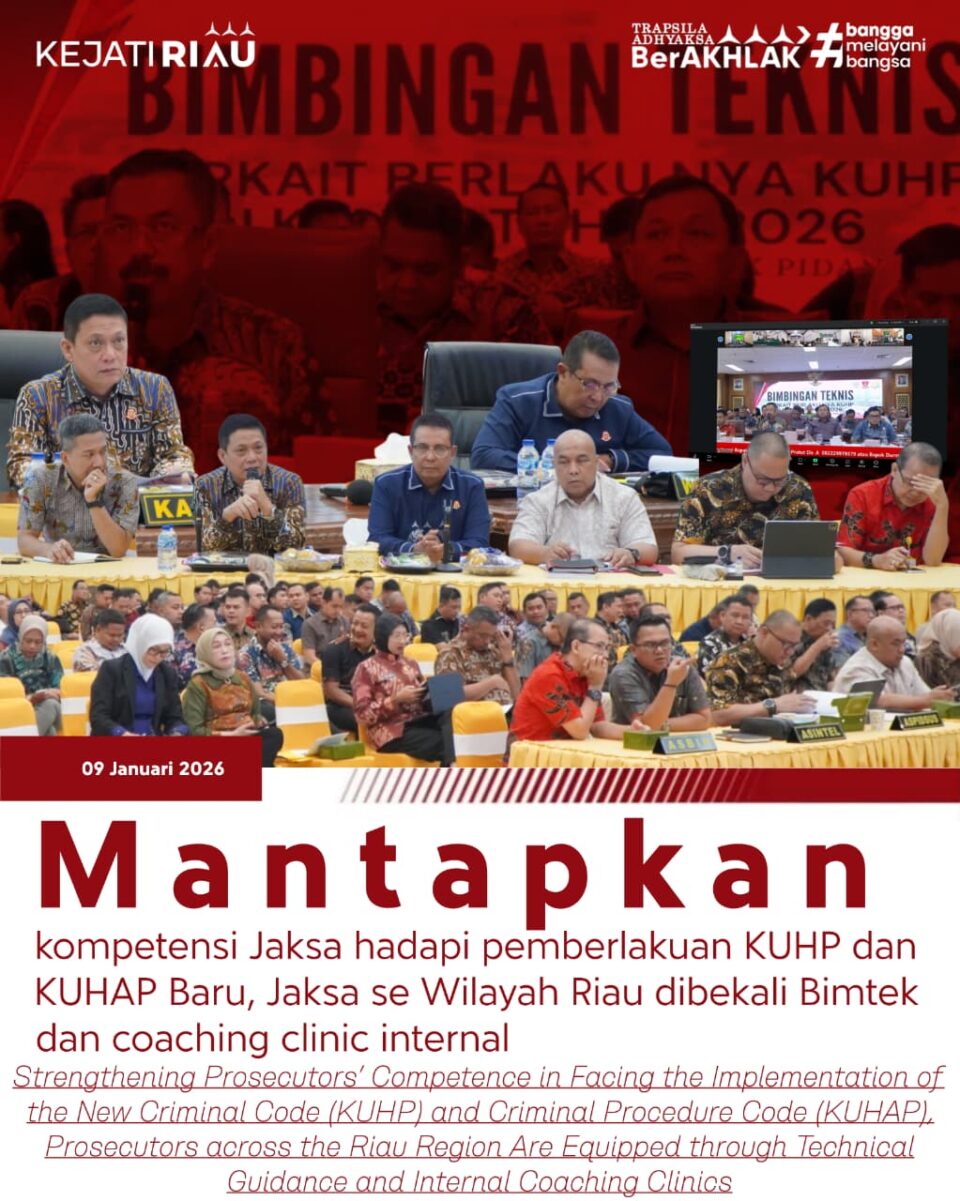 Melalui kegiatan ini diharapkan seluruh jajaran Kejaksaan di wilayah Riau memiliki pemahaman komprehensif serta mampu mengaplikasikan KUHP dan KUHAP baru secara profesional, proporsional, dan menjunjung tinggi kepastian hukum dalam setiap penanganan perkara.