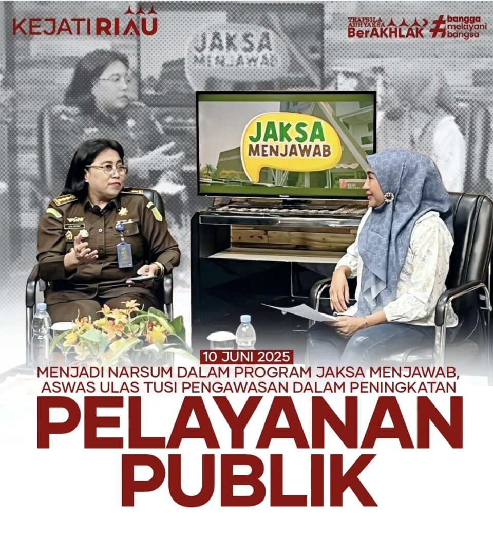 Asisten Pengawasan Kejaksaan Tinggi Riau Ayu Agung, S.H., S. Sos, M. H, M. Si (Han) menjadi narasumber dalam program “Jaksa Menjawab” bersama Riau Televisi (RTV), Selasa (10/06/2025), bertempat di Gedung RTV Kota Pekanbaru, Riau.