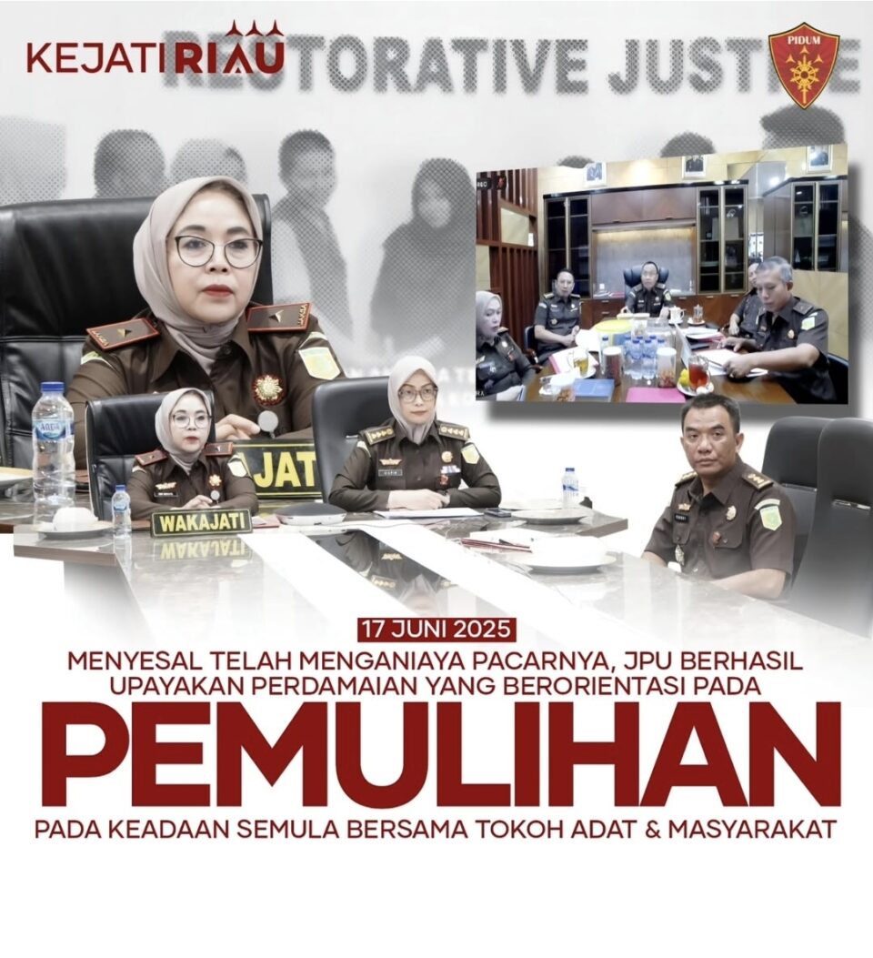 Wakajati Riau Rini Hartatie SH., MH., memimpin Pengajuan Permohonan Penghentian Penuntutan Keadilan Restoratif kepada JAM Pidum melalui Direktur A Nanang Ibrahim Soleh SH., MH., secara virtual dari Rupat Waka. (17/06/2025)