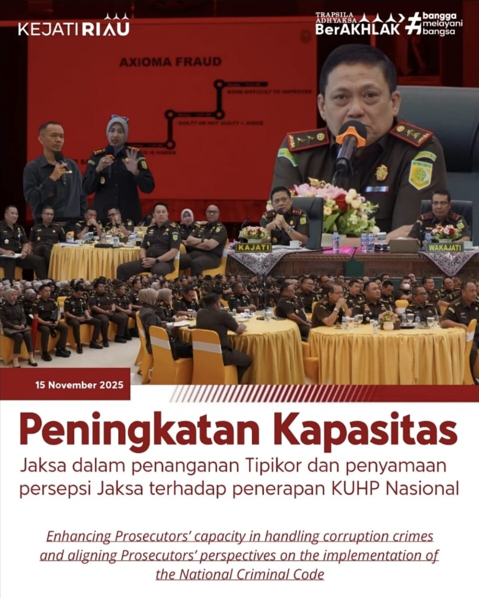 Dalam rangka peningkatan kapasitas Jaksa dalam penanganan Tipikor dan penyamaan persepsi jaksa terhadap penerapan KUHP Nasional, Kejati Riau adakan FGD, dengan pemateri Kepala BPKP Riau Evenri Sihombing dan Kajari Inhu Dr. Ratih Andrawina Suminar yang diikuti oleh seluruh jaksa satker Kejati Riau di Sasana HM. Prasetyo. (15/11/2025)