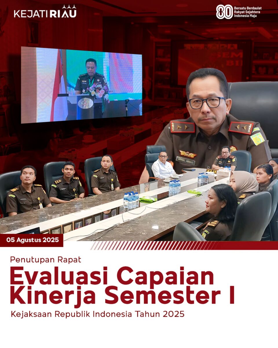 Kajati Riau Akmal Abbas SH., MH., didampingi Wakajati dan jajaran mengikuti penutupan Rapat Evaluasi Capaian Kinerja Semester I Kejaksaan RI Tahun 2025 secara daring dari Ruang Rapat Utama Kejati Riau. (09/08/2025)