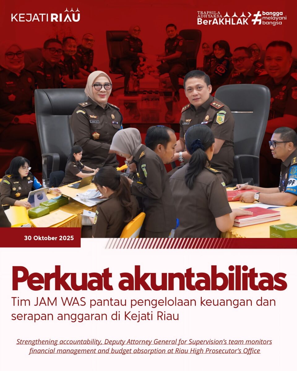Kegiatan inspeksi ini difokuskan pada pemantauan pengelolaan keuangan, serapan anggaran, serta kepatuhan terhadap tata kelola administrasi keuangan di lingkungan Kejati Riau dan seluruh satker Kejari se-wilayah hukum Kejati Riau.