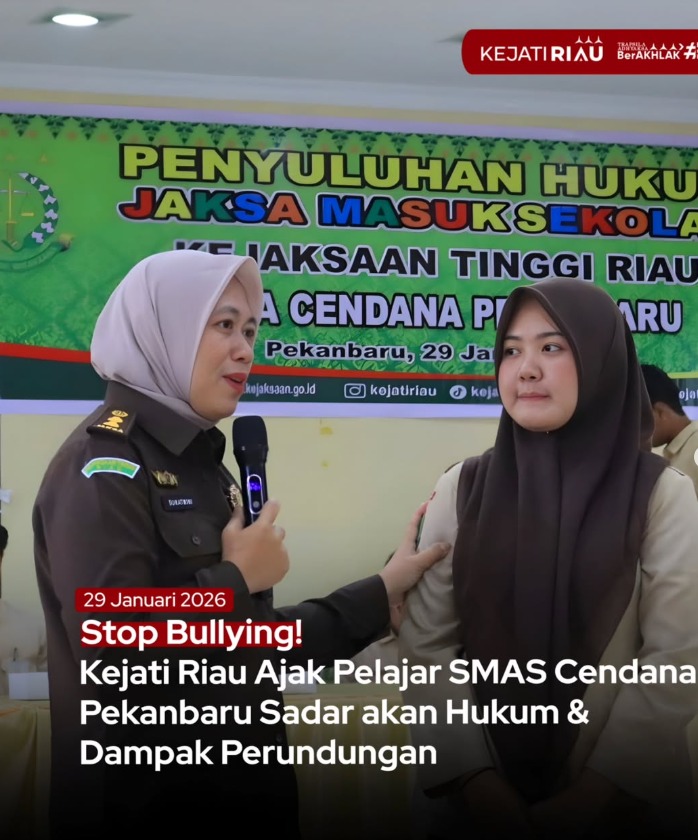 Kejati Riau kembali melanjutkan kegiatan JMS dengan mengangkat tema “Pengaruh dan Dampak Bullying bagi Generasi Muda” di SMA Cendana Pekanbaru. (29/01/2026)