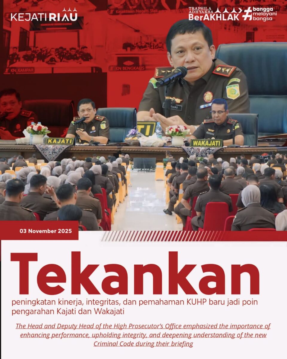 Kajati Sutikno, S.H., M.H., didampingi Wakajati Edi Handojo, S.H., M.H., memberikan pengarahan perdana kepada seluruh jajaran secara hybrid, yang diikuti oleh pegawai satuan kerja Kejati Riau serta Kejari dan Cabjari se-Riau melalui sambungan virtual dari Sasana H.M. Prasetyo Gedung Satya Adhi Wicaksana. (03/11/2025)