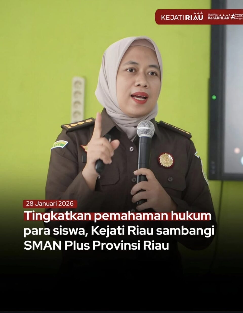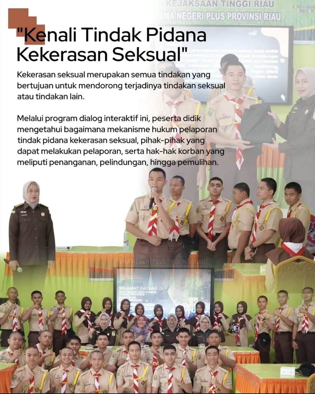 im Penkum Kejati Riau kembali dalam program JMS perdana di tahun ini dengan menyambangi SMAN Plus Pekanbaru dengan mengangkat tema “Kenali Tindak Pidana Seksual” di Aula SMAN Plus Provinsi Riau. (28/01/2026)