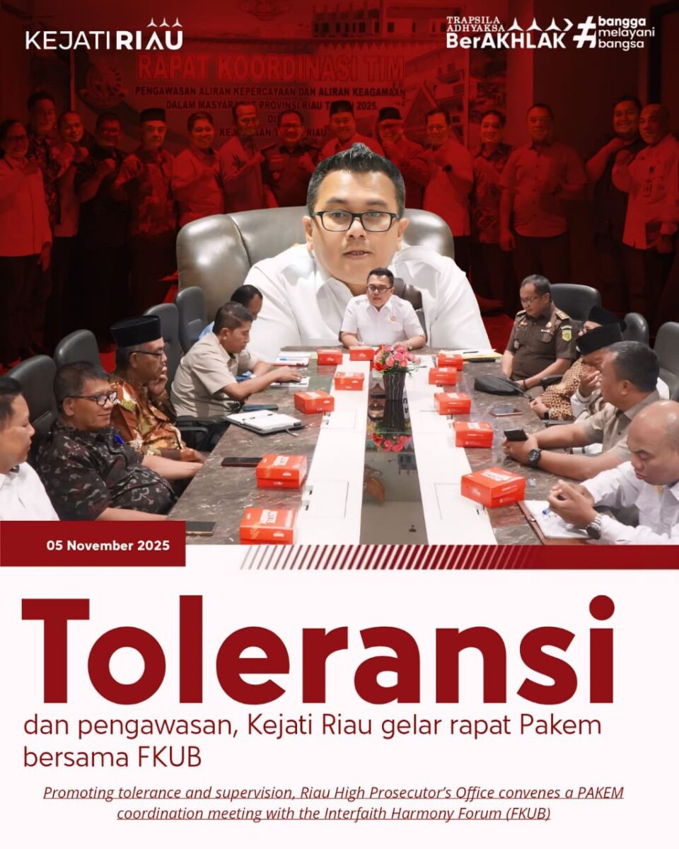 Kejati kembali menggelar rapat Pakem yang dipimpin oleh Asintel Sapta Putra, SH., M.Hum., yang dihadiri oleh perwakilan Forum Kerukunan Umat Beragama (FKUB) serta sejumlah instansi dan lembaga terkait di rupat Asintel. (05/11/2025)